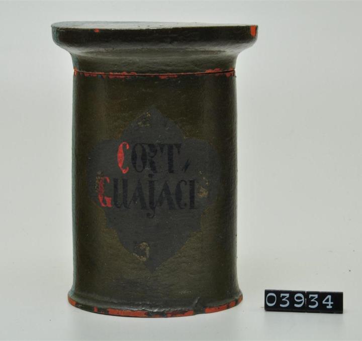 Olivgrüne, zylinderförmige Holzdose (Holzbüchse) mehrfach übermalt und umsigniert, türkisförmige Vorderseitemit freigelegtem schildförmigen Etikett. Ausgestellter Standfuß und eingepaßtem, nahezu flachem Stülpdeckel mit nach außen gebogenem Profil. Rot und schwarz signiert