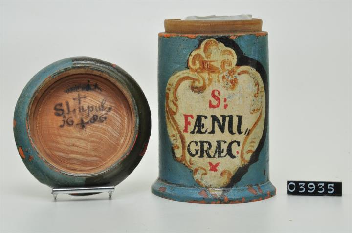 Olivgrüne, zylinderförmige Holzdose (Holzbüchse) mehrfach übermalt und umsigniert, türkisförmige Vorderseite mit freigelegtem schildförmigen Etikett. Ausgestellter Standfuß und eingepaßtem, nahezu flachem Stülpdeckel mit nach außen gebogenem Profil. Rot und schwarz signiert