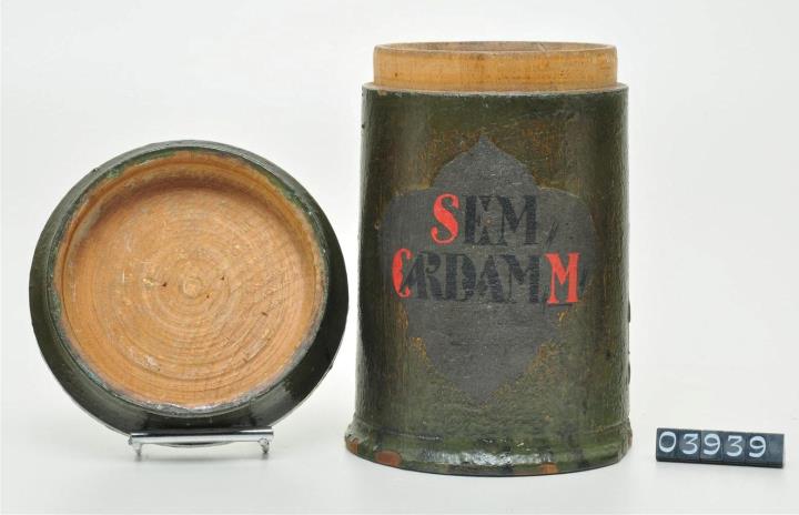Olivgrüne (dunkel), zylinderförmige Holzdose (Holzbüchse) mehrfach übermalt und umsigniert, mit schildförmigen Etikett. Ausgestellter Standfuß und eingepaßtem, nahezu flachem Stülpdeckel mit nach außen gebogenem Profil. Rot und schwarz signiert