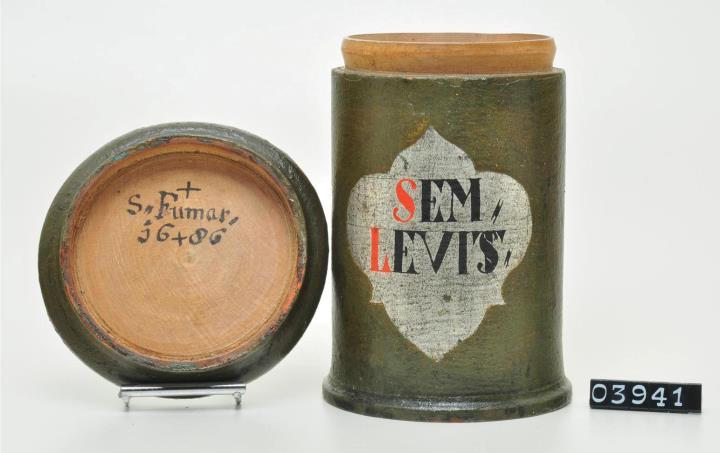 Olivgrüne (dunkel), zylinderförmige Holzdose (Holzbüchse) mehrfach übermalt und umsigniert, mit schildförmigen Etikett. Ausgestellter Standfuß und eingepaßtem, nahezu flachem Stülpdeckel mit nach außen gebogenem Profil. Rot und schwarz signiert