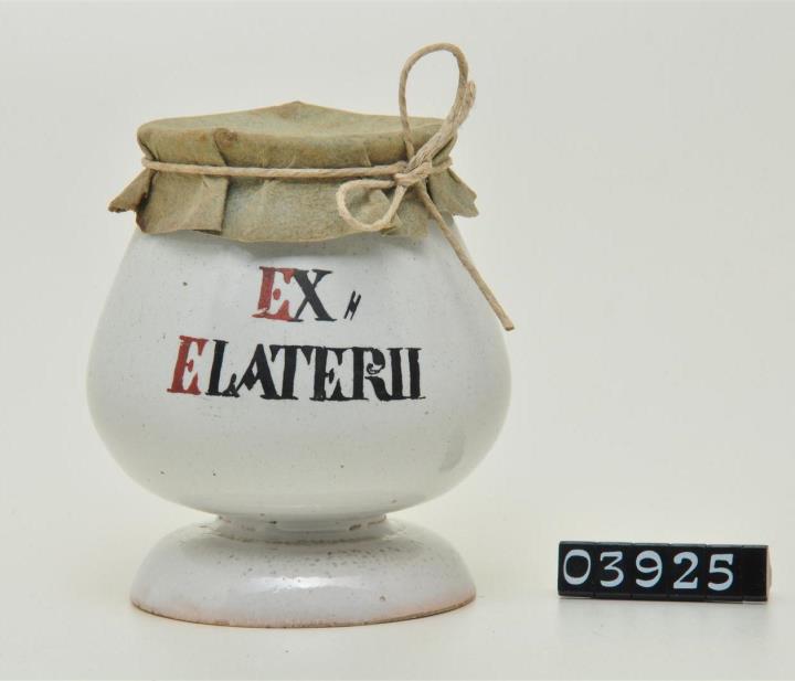 Fayance-Standgefäß; Topfform mit fast kugelartiger Grundform; enger Halsansatz, relativ flacher, breiter Gefäßfuß, hohle konvexe Form; Inschrift in rot-schwarzer Kaltmalerei, rote Anfangsbuchstaben. Tektur und Bindfaden neuwertig.