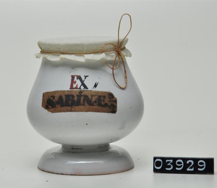 Fayance-Standgefäß; Topfform mit fast kugelartiger Grundform; enger Halsansatz, relativ flacher, breiter Gefäßfuß, hohle konvexe Form; Inschrift in rot-schwarzer Kaltmalerei, roter Anfangsbuchstabe. Auf sekundärem aufgeklebtem bräunlichem Papier zu lesen: SABINAE. Mit Tektur und Bindfaden verschlossen.