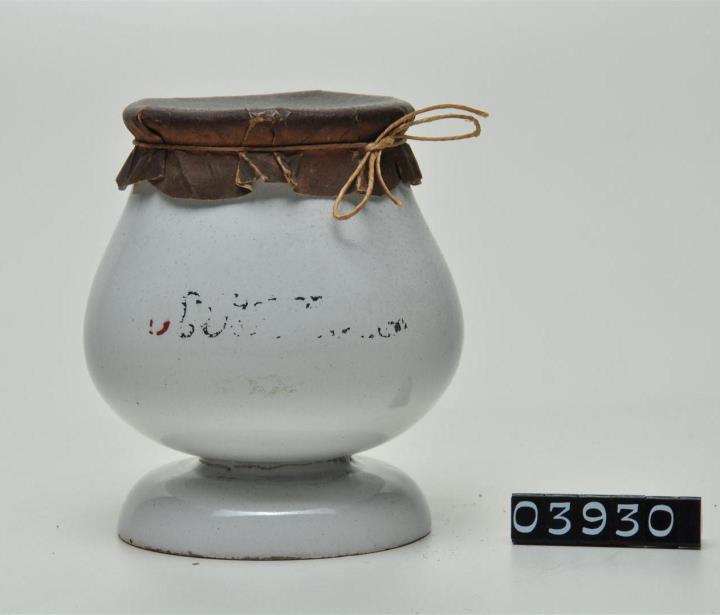 Fayance-Standgefäß; Topfform mit fast kugelartiger Grundform; enger Halsansatz, relativ flacher, breiter Gefäßfuß, hohle konvexe Form; Inschrift in rot-schwarzer Kaltmalerei, roter Anfangsbuchstabe, schwer zulesen. Mit Tektur und Bindfaden verschlossen.