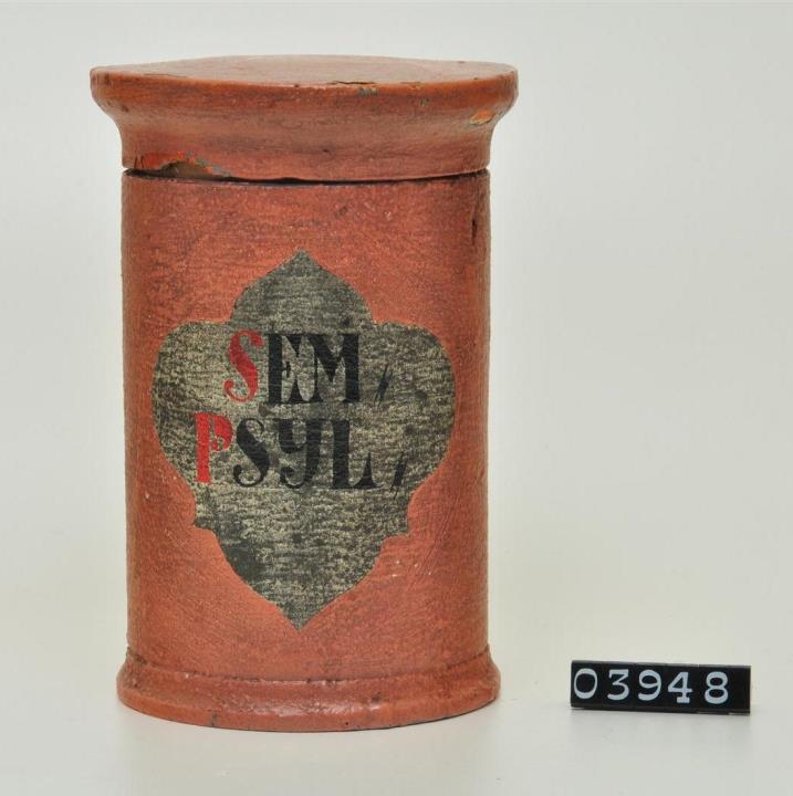 Ziegelrote, zylinderförmige Holzdose (Holzbüchse) mit abgesetztem Standfuß und eingepaßtem, flachem Stülpdeckel mit nach außen gebogenem Profil. Auf der Schauseite geschwungenes, silbernes Beschriftungsfeld. Rot und schwarz signiert