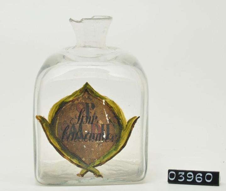 Vierkantflasche aus farblosem Glas, leicht hochgestochener Boden mit Hefteisenabriss, bis auf die Schulter überstochen. Kurzer, leicht trichterförmig sich öffnender Hals. Zitronenförmiges, goldenes Schild mit umrahmenden Zweigen in Kaltmalerei. Schwarz signiert.