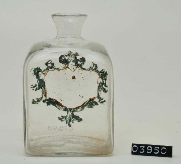 Vierkantflasche aus farblosem Glas, leicht hochgestochener Boden mit Hefteisenabriss, bis auf die Schulter überstochen. Kurzer, leicht trichterförmig sich öffnender Hals. Geschwungenes goldenes Schild (Reste) mit umgebendem grünem Blattdekor in Kaltmalerei.