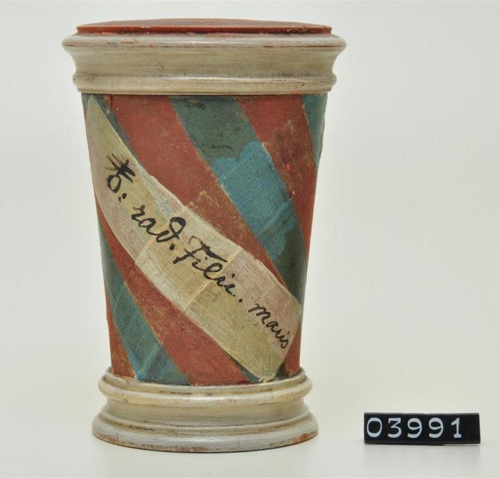 Konische Holzdose (Holzbüchse) mit abgesetztem, mehrfach profiliertem, cremefarbenem Standfuß und eingepaßtem, ebenfalls profiliertem, flachem Stülpdeckel. Rot-grüne Bemalung in schräg geführten Streifen und weißem ebenfalls schräg verlaufendem Beschriftungsfeld. Schwarz signiert