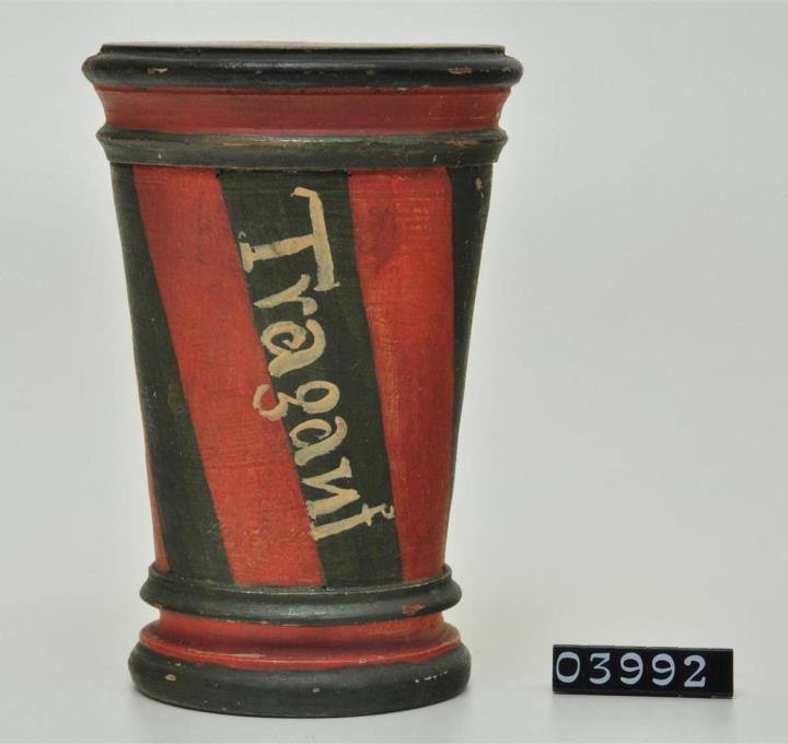 Konische Holzdose (Holzbüchse) mit abgesetztem, mehrfach profiliertem, Standfuß und eingepaßtem, ebenfalls profiliertem, flachem Stülpdeckel. Rot-schwarze Bemalung in schräg geführten Streifen und schwarzem, ebenfalls schräg verlaufendem Beschriftungsfeld.