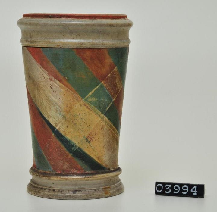 Konische Holzdose (Holzbüchse) mit abgesetztem, mehrfach profiliertem, cremefarbenem Standfuß und eingepaßtem, ebenfalls profiliertem, flachem Stülpdeckel. Rot-grüne Bemalung in schräg geführten Streifen und weißem ebenfalls schräg verlaufendem Beschriftungsfeld. Unsigniert