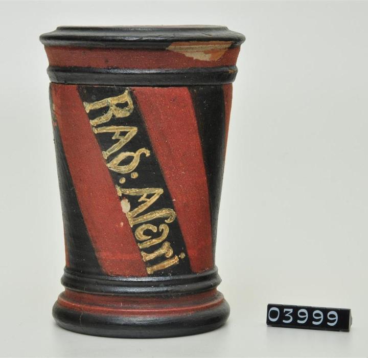 Konische Holzdose (Holzbüchse) mit abgesetztem, mehrfach profiliertem, Standfuß und eingepaßtem, ebenfalls profiliertem, flachem Stülpdeckel. Rot-schwarze Bemalung in schräg geführten Streifen und beigem, ebenfalls schräg verlaufendem Beschriftungsfeld. Zusätzliche Beschriftung auf schwarzem, schrägem Band.