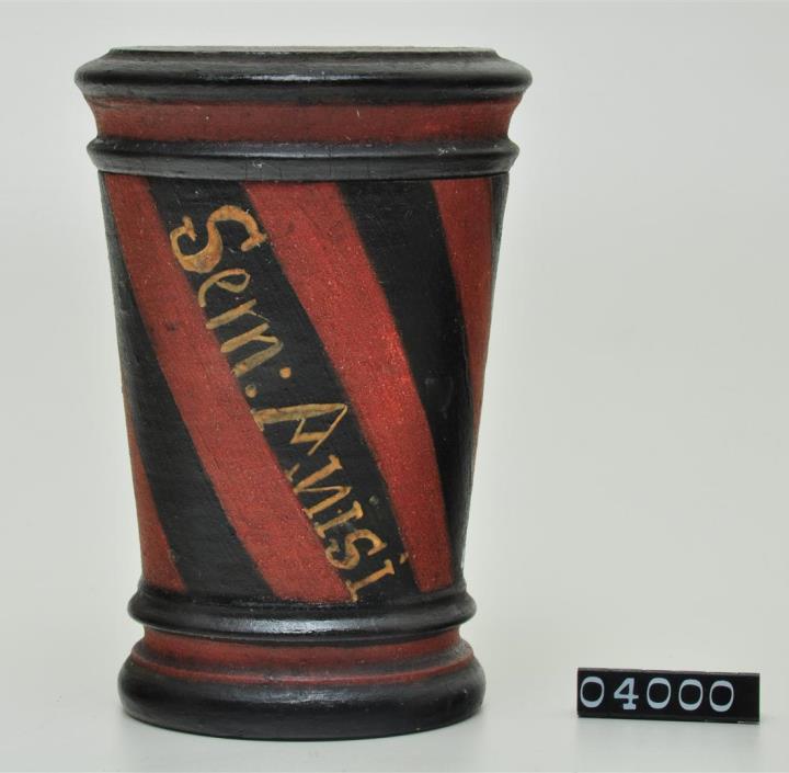 Konische Holzdose (Holzbüchse) mit abgesetztem, mehrfach profiliertem, Standfuß und eingepaßtem, ebenfalls profiliertem, flachem Stülpdeckel. Rot-schwarze Bemalung in schräg geführten Streifen und beigem, ebenfalls schräg verlaufendem Beschriftungsfeld. Zusätzliche Beschriftung auf schwarzem, schrägem Band.