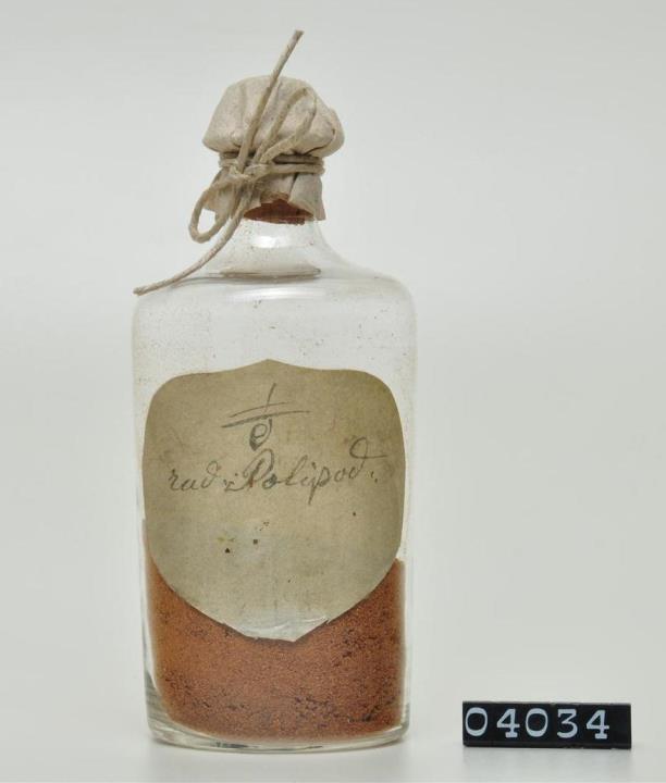 Runde, farblose Enghalsflasche mit Korkstopfen und Tektur mit Faden zugebunden. Hochgestochener Boden mit rundem Hefteisenabriss. Etikettiert und signiert.