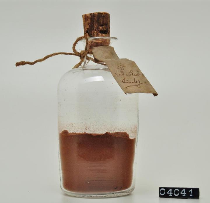 Runde, farblose Enghalsflasche mit Korkstopfen ohne Tektur. Flache Schulter. Hochgestochener Boden mit rundem Hefteisenabriss. Auf der Schriftfahne signiert.