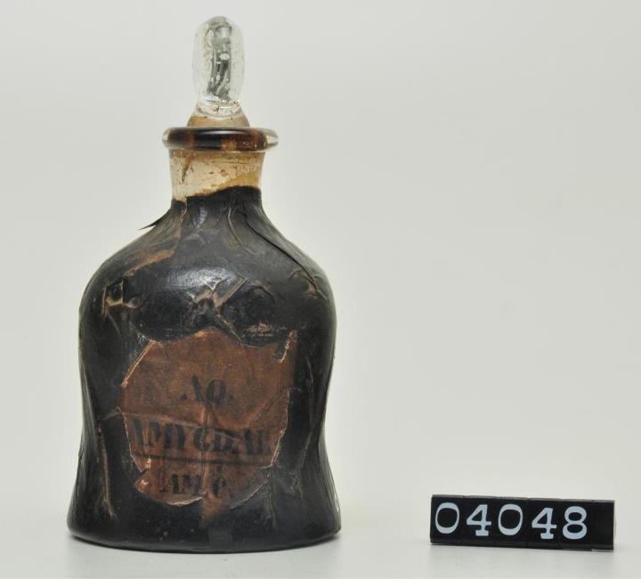 Zylinderförmige Enghalsflasche mit eingeschliffenem Griffstopfen (Massivstopfen) aus farblosem Glas und Hefteisenabriss. Vollständig mit schwarzem Papier überklebt (Lichtschutz). Vorder und Rückseite etikettiert.