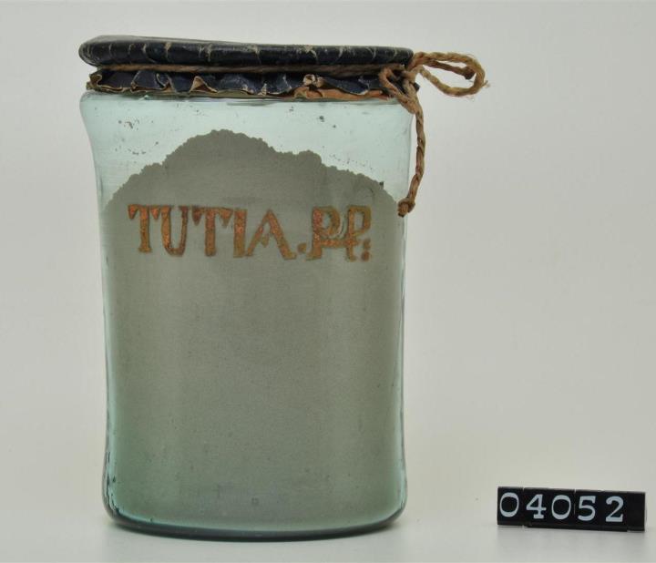 Rundes, hellgrünes Bindeglas mit blauschwarzer Tektur. Hochgestochener Boden mit rundem Hefteisenabriss. Vorderseite goldfarben signiert. Rückseite braunes signiertes Schild.
