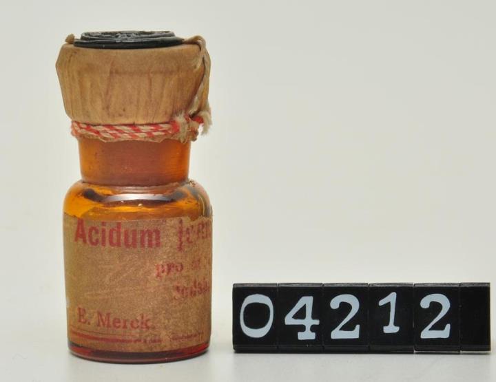 Rundes, braunes Weithalsfläschchen, Schliffstopfen mit unversehrte originaler Tektur mit Siegel. Flache Schulter, langer Hals. Etikettiert.