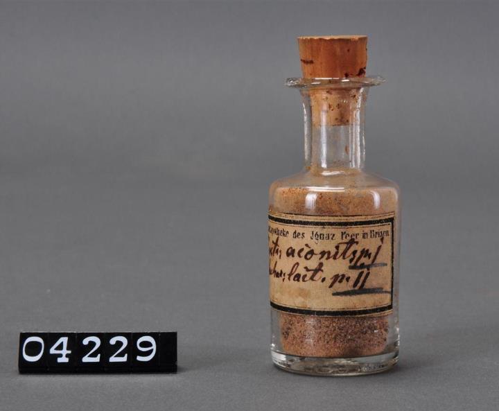 Rundes, farbloses Bindeglas mit brauner Tektur. Zugebunden mit einer Hanfschnur. Boden leicht hochgestochen, unregelmäßiger Hefteisenabriss. Signiert. Innen mit Watte ausgefüllt und einem signierten farblosen Enghalsfläschchen mit Substanz.