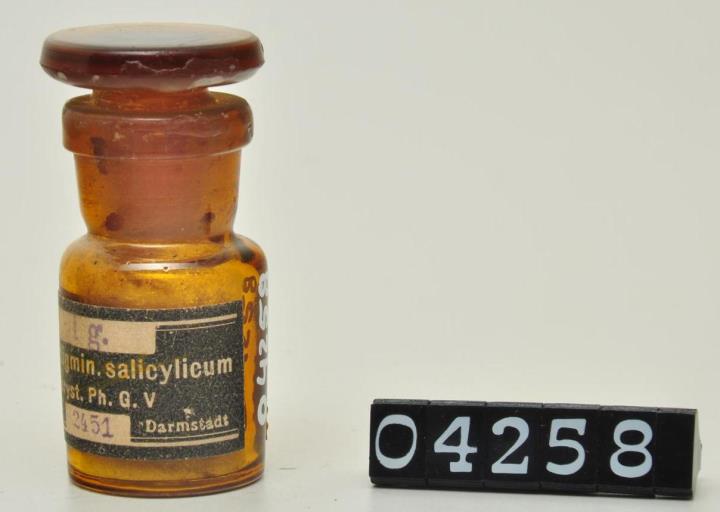 Rundes, hellbraunes leicht konisches Weithalsfläschchen mit Glasstopfen und Resten der Paraffinversiegelung an Stopfen und Hals. Etikettiert.