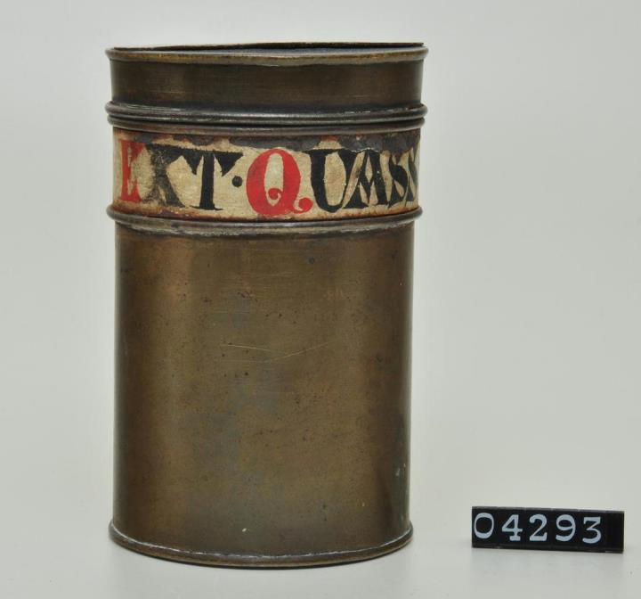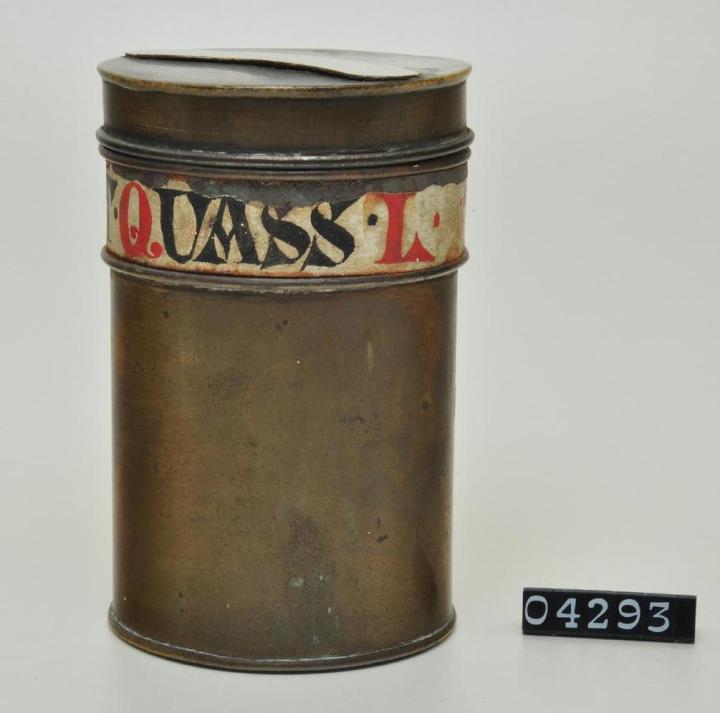 Zylinderförmige Büchse aus spezialbehandeltem Zinkblech mit auswechselbarem Signaturband. Flacher Stülpdeckel mit abnehmbarem, weißem, auswechselbarem gschwungenem Beschriftungsband. Schwarz -rot signiert