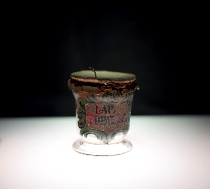 Konisch zulaufendes Bindeglas mit Fuß und ausgebogener Lippe aus farblosem Glas. Signatur in Kaltmalerei, schwarze Buchstaben und rote Anfangsbuchstaben auf nachgedunkeltem goldenen Untergrund umgeben von Rankenwerk. Originalsignatur übermalen. Hochgezogener Boden mit Hefteisenabriss. Braune Papiertektur, befestigt mit Hanfschnur.