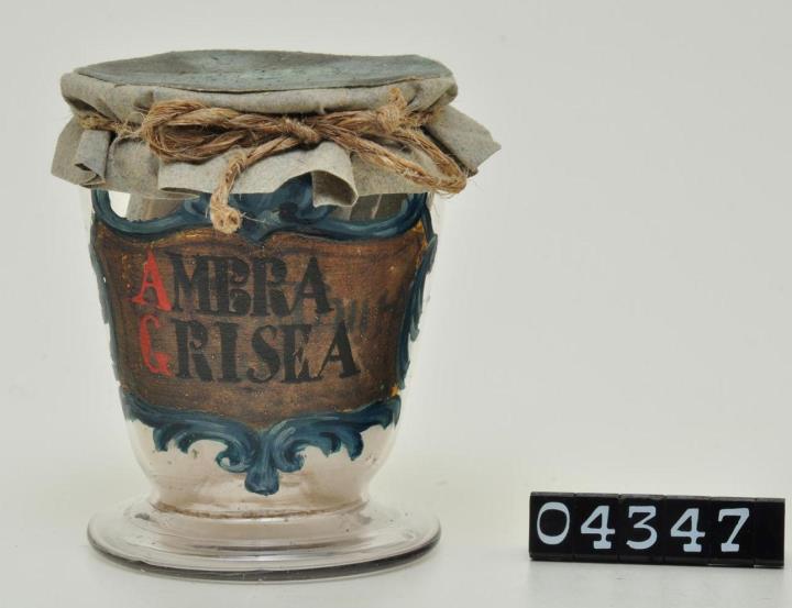 Konisch zulaufendes Bindeglas mit Fuß und ausgebogener Lippe aus farblosem Glas. Signatur in Kaltmalerei, schwarze Buchstaben und rote Anfangsbuchstaben auf nachgedunkeltem goldenen Untergrund umgeben von Rankenwerk. Originalsignatur übermalen. Hochgezogener Boden mit Hefteisenabriss. Blaue Papiertektur, befestigt mit Hanfschnur, mit aufgeklebter Preisangabe. In Watte gebettete Substanz in Briefchen verpackt.