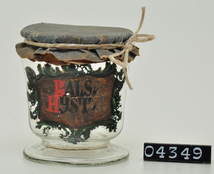 Konisch zulaufendes Bindeglas mit Fuß und ausgebogener Lippe aus farblosem Glas. Signatur in Kaltmalerei, schwarze Buchstaben und rote Anfangsbuchstaben auf nachgedunkeltem goldenen Untergrund umgeben von Rankenwerk. Originalsignatur übermalen. Hochgezogener Boden mit Hefteisenabriss. Blaue Papiertektur, befestigt mit Hanfschnur.
