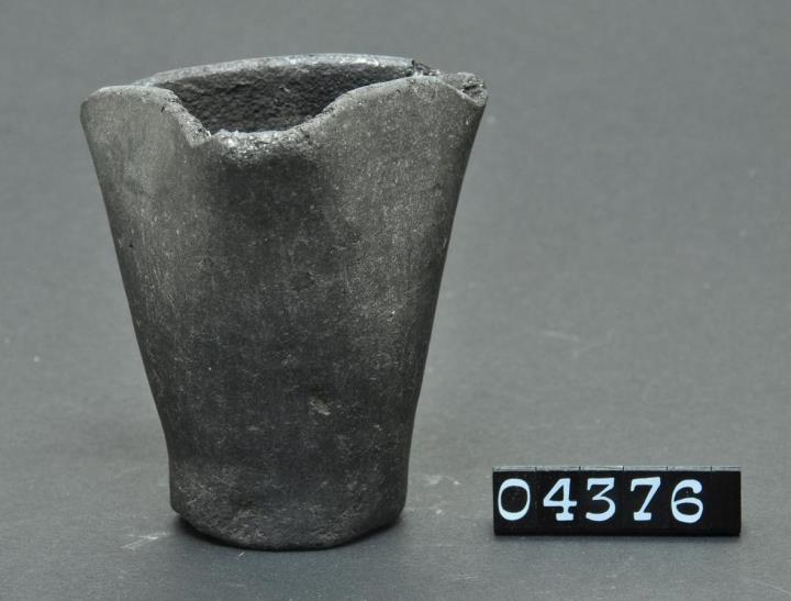 Schmelztiegel aus Graphit-Ton-Gemisch. Die Beimengung von Graphit macht die Keramik widerstandsfähig gegen hohe Temperaturen und starke Temperaturschwankungen, wie sie in der Metallverarbeitung üblich sind, sowie gegenüber aggressiven Chemikalien. Darüber hinaus dichtet der Graphit den Behälter ab, so dass auf eine Glasur verzichtet werden kann, und glättet die Wandung, wodurch das vollständige Ausgießen des Inhalts ermöglicht wird. Neuwertig, Aussenseite glatt. Mit Prägung am Boden.