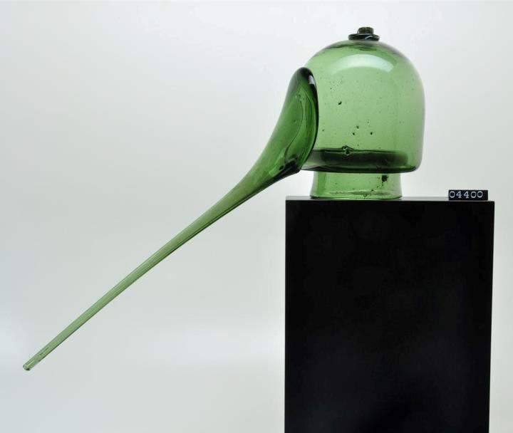 Alambik, Alambique, Alembicus, Destillierhelm, Brennhut, in der Alchemie auch Caput Mauri, Capitellum oder Galea genannt aus grunem Glas und aufgesetzter Tülle. Oben knaufartiger Glasposten aufgesetzt; Hefteisenabriss. Tülle (= norddeutsch) in Originallänge. Im Alembic kondensierten die aufsteigenden Dämpfe, wurden abgekühlt und liefen über das Ablaufrohr in ein Auffanggefäß (Fürsetzglas).