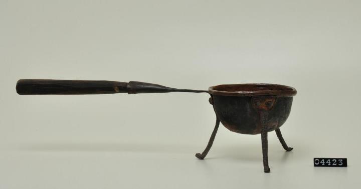 Offene, halbkugelförmige Pfanne aus Kupfer. Dreifüßig zum Aufstellen auf dem Ofen mit offenem Feuer. Angenietete Füße und angenieteter Griff als Rohransatz für Holzstab aus Eisen.