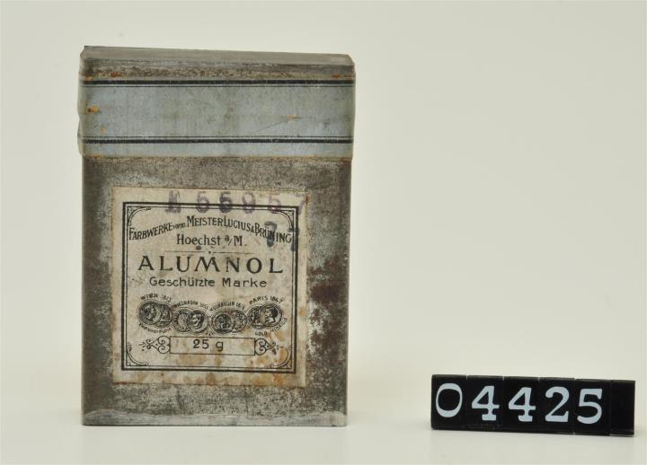 Rechteckige Blechdose mit Stülpdeckel, versiegelt mit einem bedruckten Papierband.. Rückseite geprägter, legender Löwe mit Wappenschild. Desinfizierendes Pulver zum Auflösen für Spülungen bei Geschlechtskrankheiten, hergestellt von den Farbwerken Hoechst.