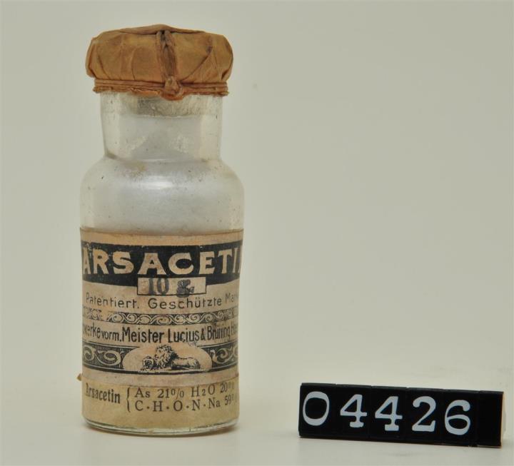Farbloses Weithalsfläschchen mit Korken und brauner Papiertektur mit Papiersiegel. Bedrucktes Etikett. Von Paul Ehrlich entdeckte Arsenverbindung gegen Syphilis, hergestellt von den Farbwerken Hoechst.