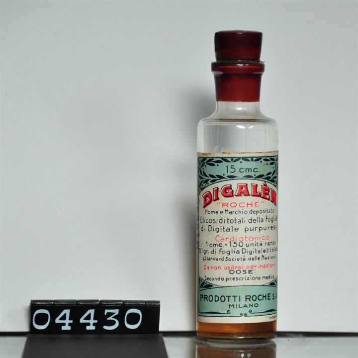 Zylinderförmiges hohes Fläschchen mit original versiegeltem rotem Gummistopfen. Etikettiert. Entsprechend der Wirkung am Froschherzen standadisierter Fingerhut-Extrakt zur Herz-Kreislauf Behandlung; 1ccm entspricht 150 Frosch-Einheiten. Hersteller Firma Roche, Mailand.
