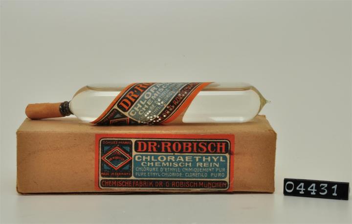 Beidseitig verschmolzener Glaszylinder mit Etikette. Eingeschmolzenes Metallgewinde an oberem Ende. Verpackt in einem Faltkarton. Etikettiert. Zur lokalen Anästhesie verwendet. Hersteller Chemische Fabrik Dr. Robisch, München.