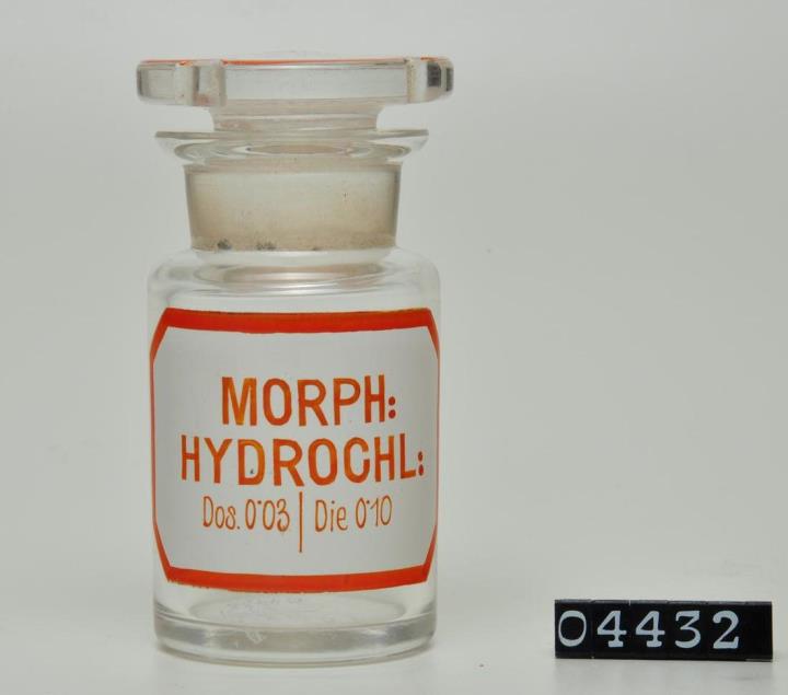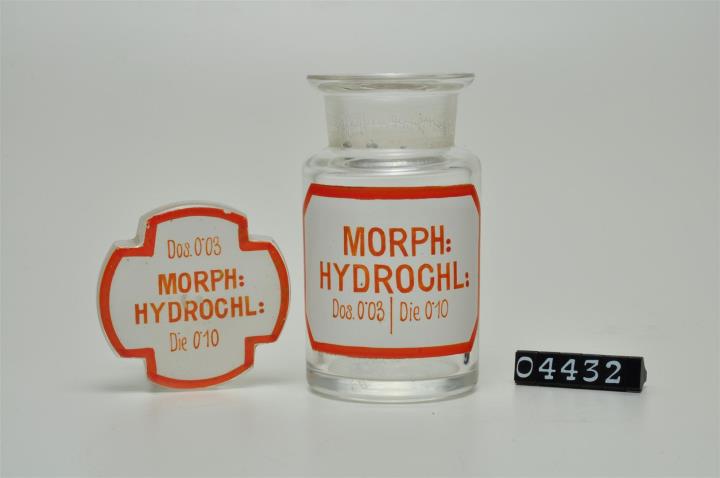 Rundes, farbloses Pulverglas mit signiertem Kreuzstopfen (Massivstopfen). Ausgebogener, abgeflachter Mündungsrand. Achteckiges, weißes Emailleschild mit rotem Rand. Rot signiert.