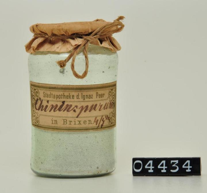 Rundes, grünstichiges Bindeglas mit beschriebener Papiertektur. Hochgestochener Boden mit rundem Hefteisenabriss. Signiert. Chinin, ein Alkaloid und pflanzlicher Inhaltsstoff der Chinarinde, ist ein antiparasitärer Wirkstoff, der zur Behandlung der Malaria verwendet wird. (Therapie akuter Schübe von durch P. falciparum verursachten Chloroquin-resistenten Malariainfektionen.) Ca. 1820 entdeckt.