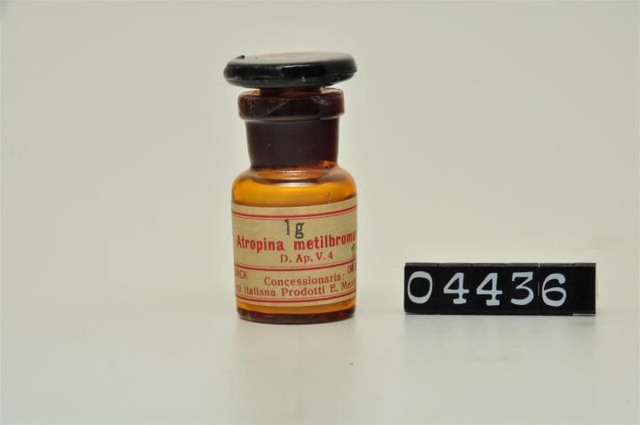 Rundes, leicht konisches braunes Weithalsglas mit Schliffstopfen. Leicht gewölbter Boden mit eingeprägter "4". Reste der Paraffinversiegelung am Hals und Stopfen. Signiert. Atropin ist ein Inhaltsstoff aus verschiedenen Pflanzen der Familie der Nachtschattengewächse und ist z.B. in der Tollkirsche, im Bilsenkraut und im Stechapfel enthalten. Wird bei verschiedenen Erkrankungen des Auges und des Herzens eingesetzt. 1831 entdeckt.