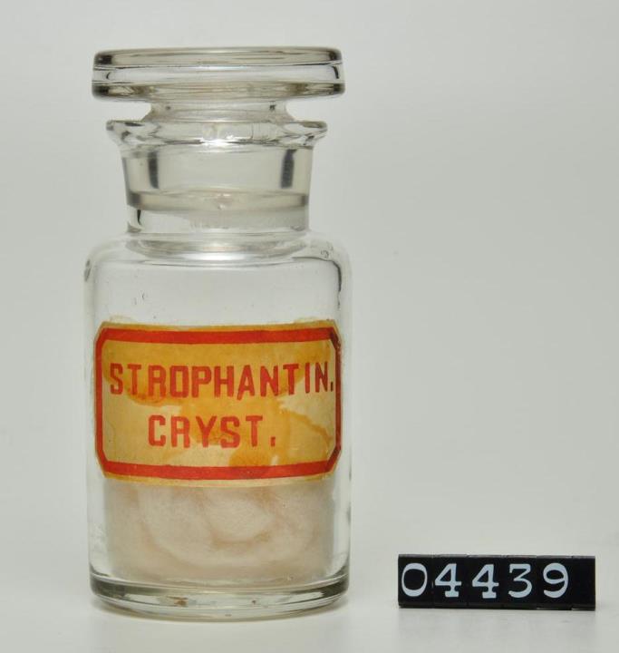 Runde, zylinderförmige, farblose Weithalsflasche mit flacher Schulter und Glasstopfen. Innen mit Watte zum Schutz der Originalsubstanz ausgekleidet. (siehe 04440). Signiert. Strophantin wurde von den Eingeborenen Afrikas als Pfeilgift verwendet. Zählt zu den herzwirksamen Glycosiden d.h. es kann auf das Herz eine die Schlagkraft steigernde und die Herzfrequenz senkende Wirkung entfalten.