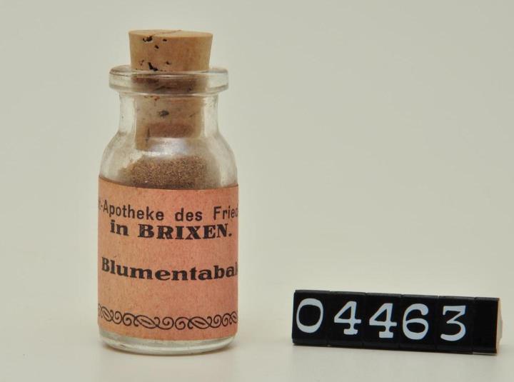Kleines farbloses Weithalsfläschchen mit verstärkter Mündung und Korken. Gefüllt mit einer pflanzlichen Schnupftabakmischung. Signiert. Das Fläschchen wurde recycelt, ursprünglich diente das Fläschen für ein Antibiotikum zum Spritzen.
