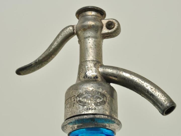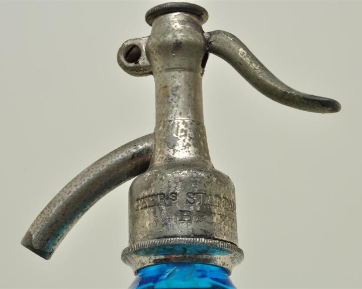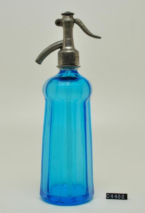 Hellblaue, runde, dickwandige, vielkantige, konische Glasflasche für kohlensäurehaltige Getränke mit ausgebuchteter Schulter. Planer Standboden. Hebel für Pump-Druck-Verschluss aus Zinkspritzguß und innenliegendem Glasrohr.