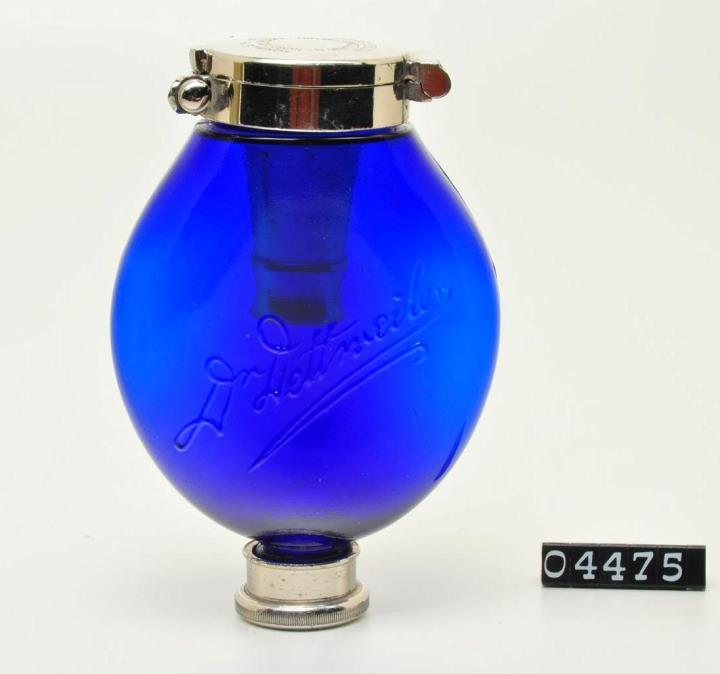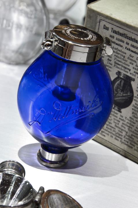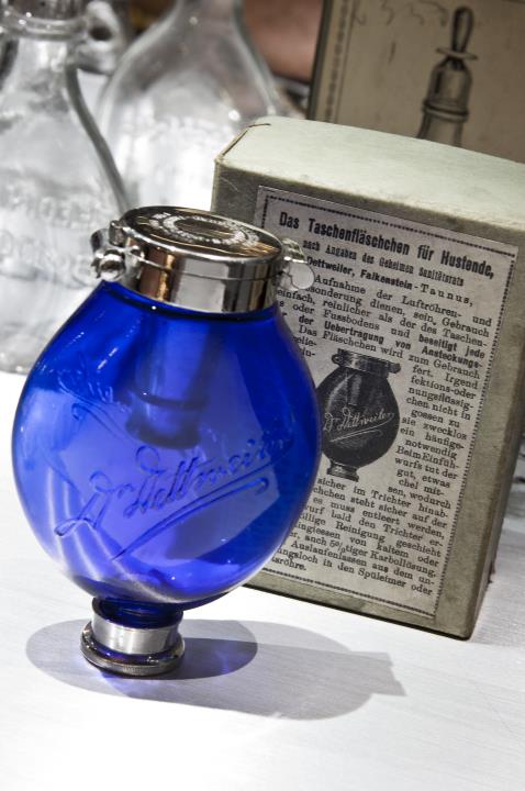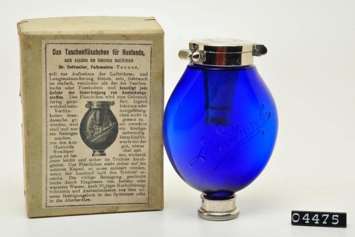 Hochovale kobaltblaue Flachflasche aus Glas mit untenliegendem Schraubverschluß und obenliegendem Schnappdeckel (Schraubkappenverschluß), häufig aus vernickeltem Eisen. Dient zur Aufnahme des Auswurfs Lungenkranker. Im Originalkarton mit Beschreibung und Verkaufspreis von Lire 25.