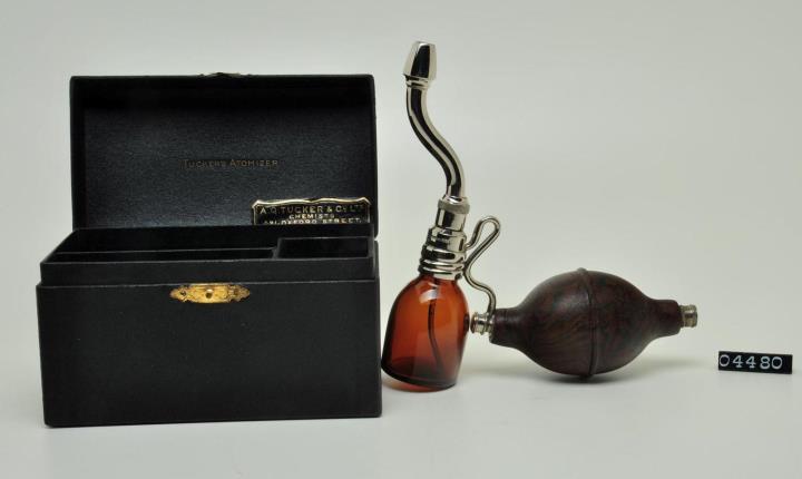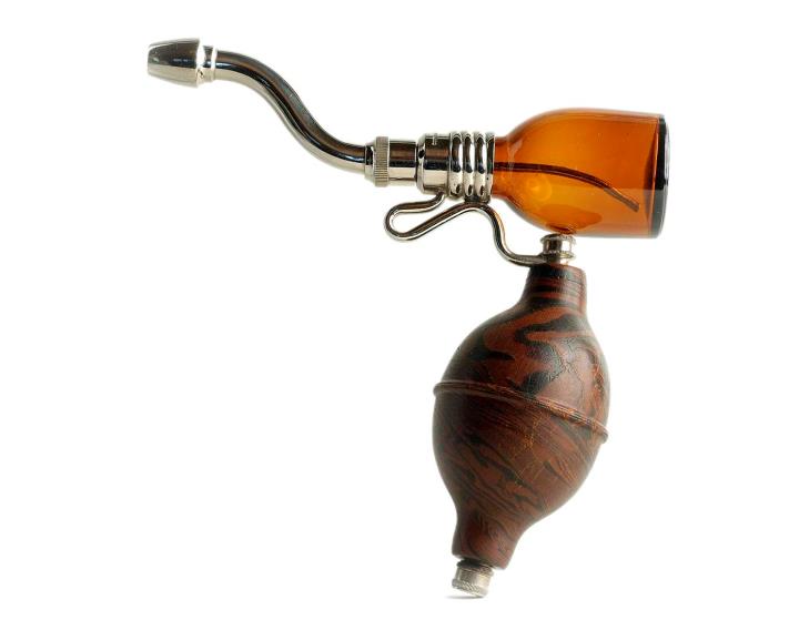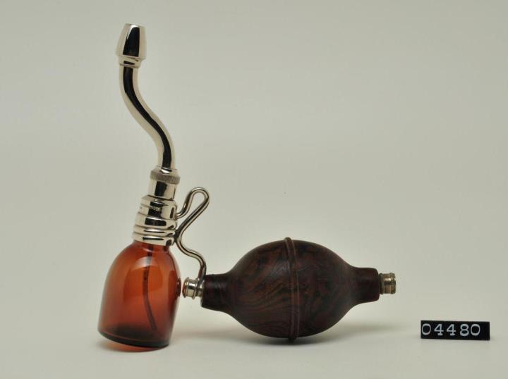 Baunes rundes Fläschchen mit hochgezogener Schulter und Schraubgewinde. Metallenes Rohr mit Schraubgewinde, Mundstück und Gummiblasball. Schwarz überzogener Originalkarton und Reinigungsdraht.