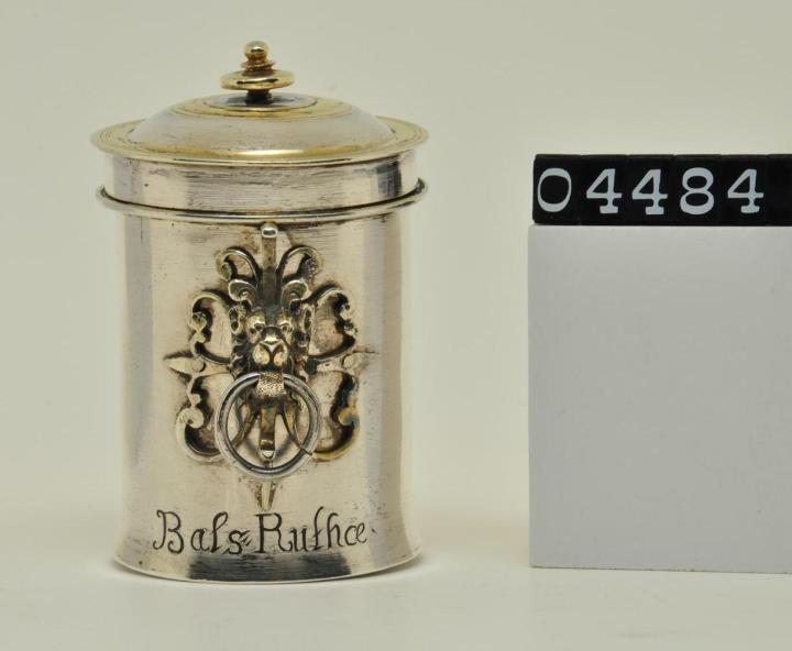 Zylindrisches Silbergefäß, teilvergoldet, mit Innenvergoldung. Flacher Stand mit profiliertem Rand. Abgeflachter Stülpdeckel mit Kreiselknauf. Auf Schauseite aufwendig durchbroches gearbeitetes Löwenmaskaron mit beweglichem Ring im Maul. Am Boden mit Meistermarke. Mündungsrand mit gravierter"II", Stülpdeckel-Innenrand mit gravierter "II" Die Meisermarke NK bezieht sich auf Nikolaus Kolb geboren 1555, heiratet 1582, gestorben 1621. Kolb stammt aus Nürnberg. Er arbeitete zwischen 1610 -1617 am "Pommersche Kunstschrank" mit.