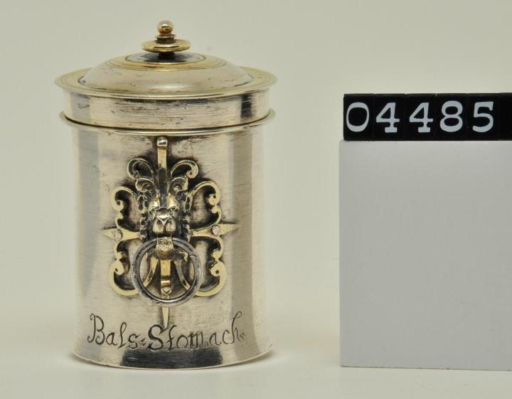 Zylindrisches Silbergefäß, teilvergoldet, mit Innenvergoldung. Flacher Stand mit profiliertem Rand. Abgeflachter Stülpdeckel mit Kreiselknauf. Auf Schauseite aufwendig durchbroches gearbeitetes Löwenmaskaron mit beweglichem Ring im Maul. Am Boden mit Meistermarke. Mündungsrand mit "I" graviert, Stülpdeckelinnenrand "I". Die Meisermarke "NK" bezieht sich auf Nikolaus Kolb geboren 1555, heiratet 1582, gestorben 1621. Kolb stammt aus Nürnberg. Er arbeitete zwischen 1610 -1617 am "Pommersche Kunstschrank" mit.