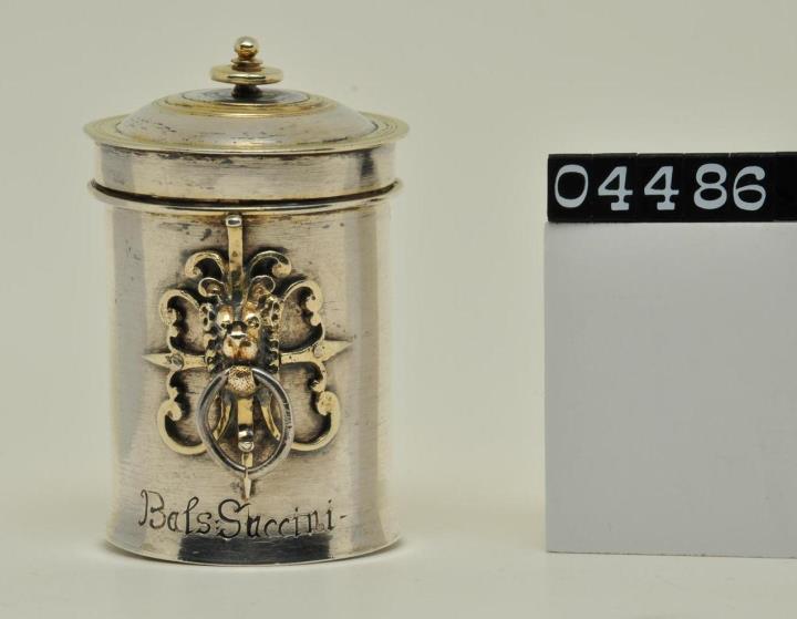 Zylindrisches Silbergefäß, teilvergoldet, mit Innenvergoldung. Flacher Stand mit profiliertem Rand. Abgeflachter Stülpdeckel mit Kreiselknauf. Auf Schauseite aufwendig durchbroches gearbeitetes Löwenmaskaron mit beweglichem Ring im Maul. Am Boden mit Meistermarke. Mündungsrand mit " V" graviert, Stülpdeckel-Innenrand "V". Die Meisermarke "NK" bezieht sich auf Nikolaus Kolb geboren 1555, heiratet 1582, gestorben 1621. Kolb stammt aus Nürnberg. Er arbeitete zwischen 1610 -1617 am "Pommersche Kunstschrank" mit.