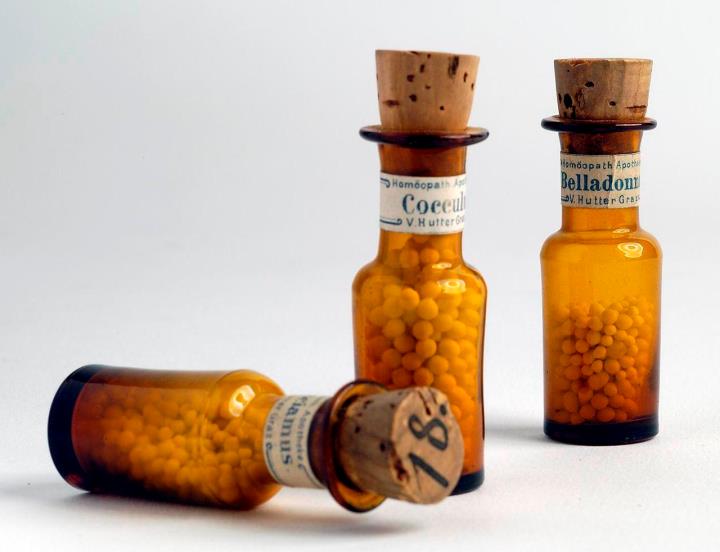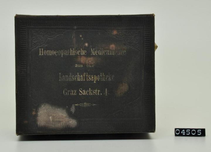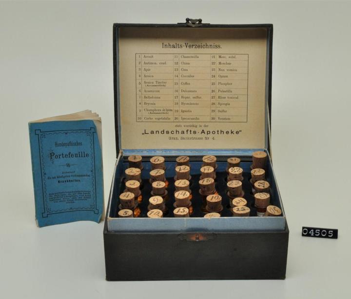 "Homöopathische Medicamente aus der Landschaftsapotheke Graz Sackstr. 4." und einer nach Krankheitsbildern geordneten Beschreibung "Homöopathisches Portefeuille". Kästchen aus Karton mit 30 verschiedenen homöopathischen Zubereitungen; die Arzneiensind in kleinen Glasflacons aufbewahrt, am Flaschenhals etekettiert und mit oben numerierten Korkstopfen verschlossen; im Deckel des Kästchens ist das Inhaltsverzeichnis abgedruckt. Rückseite aufgeklebtes Bild mit dem Herzen Jesu.