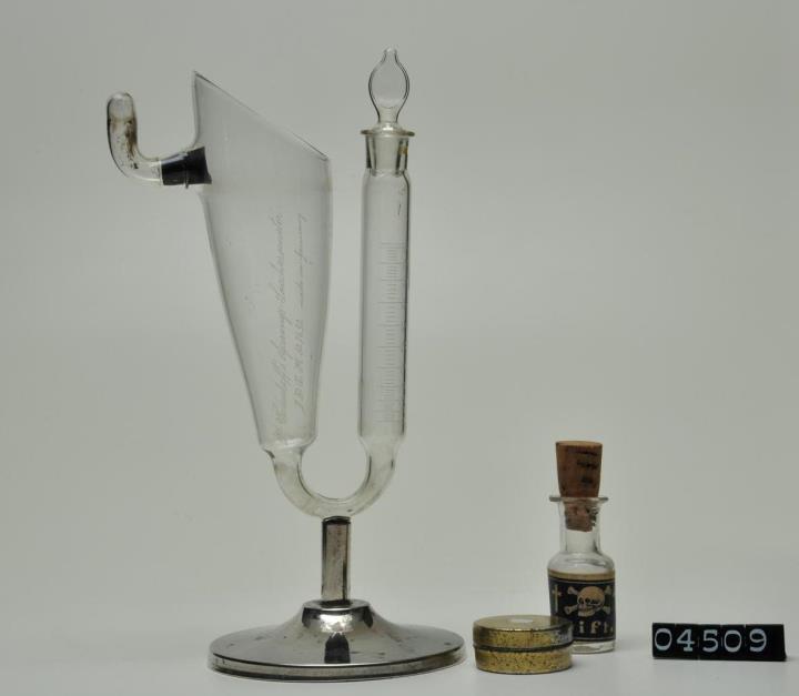 Präzisions-Gärungs-Saccharometer mit Quecksilberfang nach Dr. Weidenkaff, D. R. G. M., zur chemisch-quantitativen Bestimmung des Traubenzuckers in Harn, Most, etc., kleines Modell, mit vernickeltem Metallfuß. Gebrauchsanweisung, Schmierfett und Giftfläschchen.