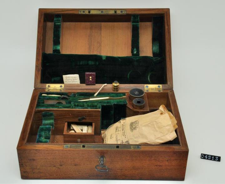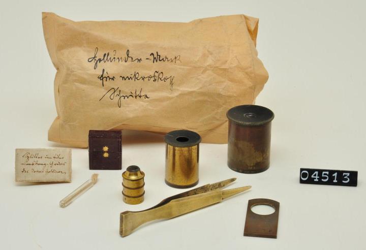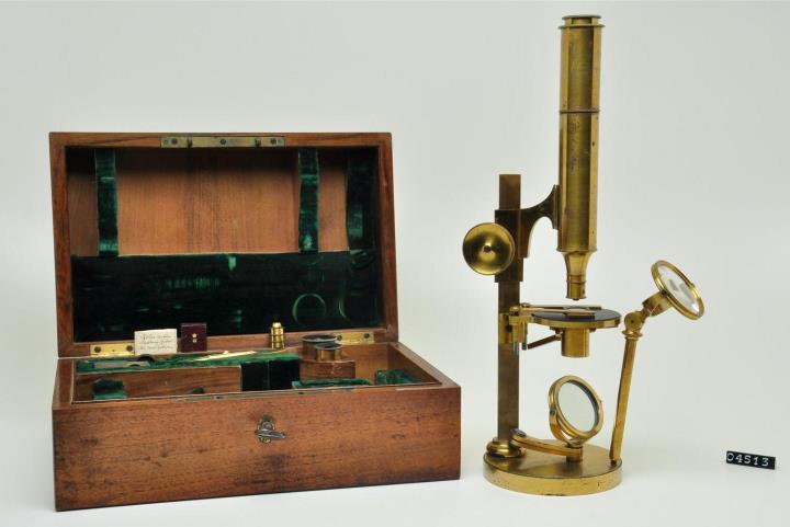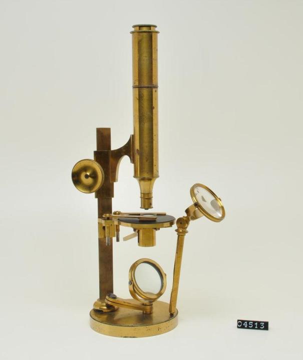 Mikroskop aus Messing mit abschließbarer Nußholzkassette der Firma Plößl Simon in Wien. Runder Fuß, dreieckige Messingtriebsäule mit eingelassener Zahnstange, rechtseitiger Grobtrieb, Beleuchtungshohlspiegel mit mattschwarzer Seite in kardanischer Aufhängung. Für Auflichtbeleuchtung Lupe auf höhenverstellbarem Stativ. Feststehender Objekttisch. Tisch für einschiebbare Blende und oben zwei Gasplättchenhalter aus Messing. Starrer Tubus mit Einschiebeschlitz für Maßeinteilungen. Verschiedenes Zubehör wie Okulare, Deckgläser Objektträger, Pinsel sowie Holunder-Mark für Mikroskop-Schnitte.