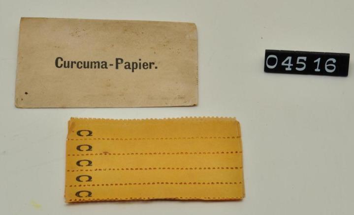 Kleiner Umschlag mit Curcuma-Papier der Firma C. Hilber. Innen jeweils fünf Blätter mit jeweils fünf perforierten getränkten Streifen Curcumapapier dient dem Nachweis von Borsäure und Boraten. Das Papier ist mit Curcumin, dem gelben Farbstoff der Curcuma-Wurzelknollen (Gelbwurz, gelber Ingwer) imprägniert. Zur Durchführung des Nachweises taucht man das Testpapier in die salzsaure Untersuchungslösung ein (pH 1-2) und lässt es anschließend trocknen. Je nach Borat-Konzentration verfärbt sich das gelbe Papier orange bis rot. Anschließendes Eintauchen in konzentrierte Natronlauge führt bei Anwesenheit von Borat zu einer grün-schwarzen Färbung. Ist kein Borat vorhanden verfärbt sich das Testpapier mit Laugen Braun-Rot.