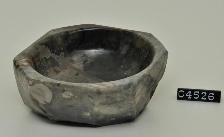 Normalwandige Schalenform, außen grob bearbeitet, eckige Mündung. Innenseite halbkugelig glatt gerundet. Pistill fehlt. Die Härte des Materials, die glatte Oberfläche und die chemische Beständigkeit, außer gegen Flusssäure, machte Achat zum idealen Werkstoff für Reibschale und Pistill. In den 60 und 70ziger Jahren des 19.Jh. galt der Achatmörser bei den Doctores in der chemischen Industrie als Statussymbol. (wikipedia)