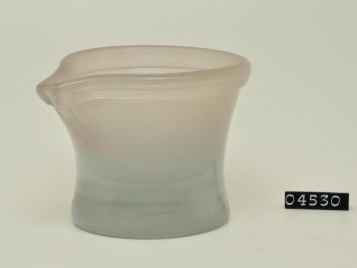 Reibschale aus weißem Glas mit Ausgussschnabel. Massiver Standfuß, umgeschlagener Rand. Ohne Pistill. Hefteisenabris ausgeschliffen. Zum Pulvern nahezu aller Materialien geeignet.